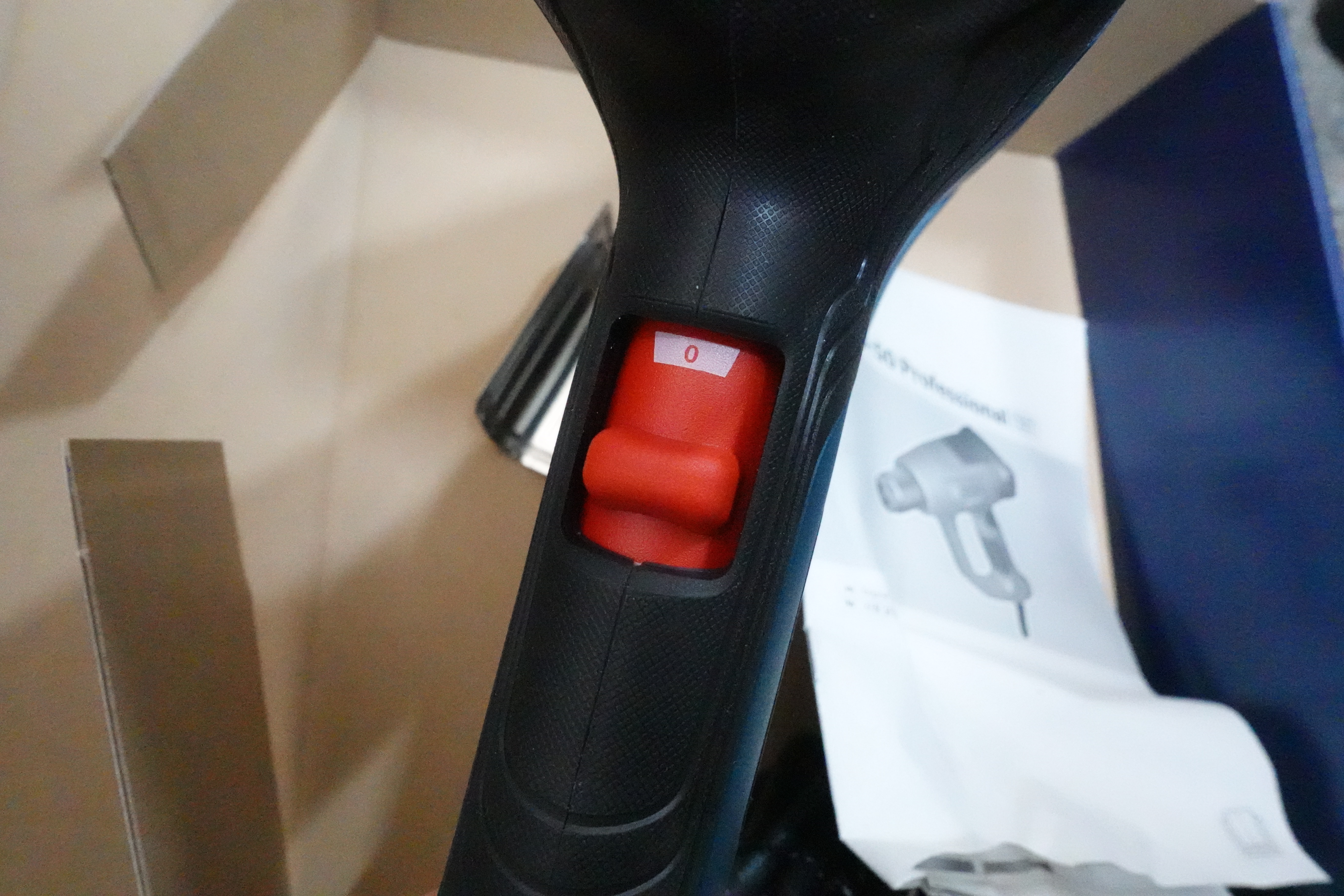 온도 및 기류 조절이 가능합니다. 빨간색 스위치로 편리하게 조절 가능합니다. 작동하면서 변경시킬 수 있어서 본인에게 맞는 강도로 조절해서 사용하면 됩니다. 2단계 온도/풍량을 설정할 수 있습니다. 1단은 온도 300도로 풍량은 240정도 입니다. 2단은 온도 500정도로 풍량은 450입니다.